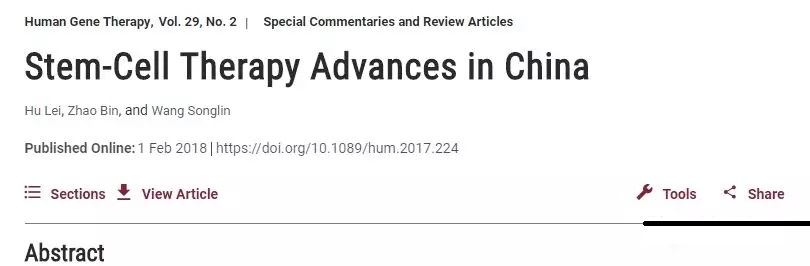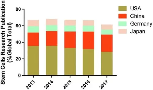 2018年2月,《Human Gene Therapy》杂志刊发的《中国干细胞治疗进展》显示, 2006年,我国科研人员发表的干细胞科技论文数量未及全球干细胞研究出版物总数的3%;2017年,我国干细胞科技论文数量占到了全球干细胞出版物总数的20%,仅次于美国,位居全球第二。2016年至2017年之间,仅国家重点研发计划“干细胞及转化研究”重点专项支持的项目团队就有40余篇文章刊登在《自然》和《细胞》杂志及其子刊上。