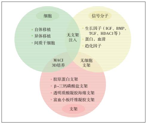 细胞治疗模式图。细胞、信号分子、支架是实现细胞治疗修复软骨的三个重要因素