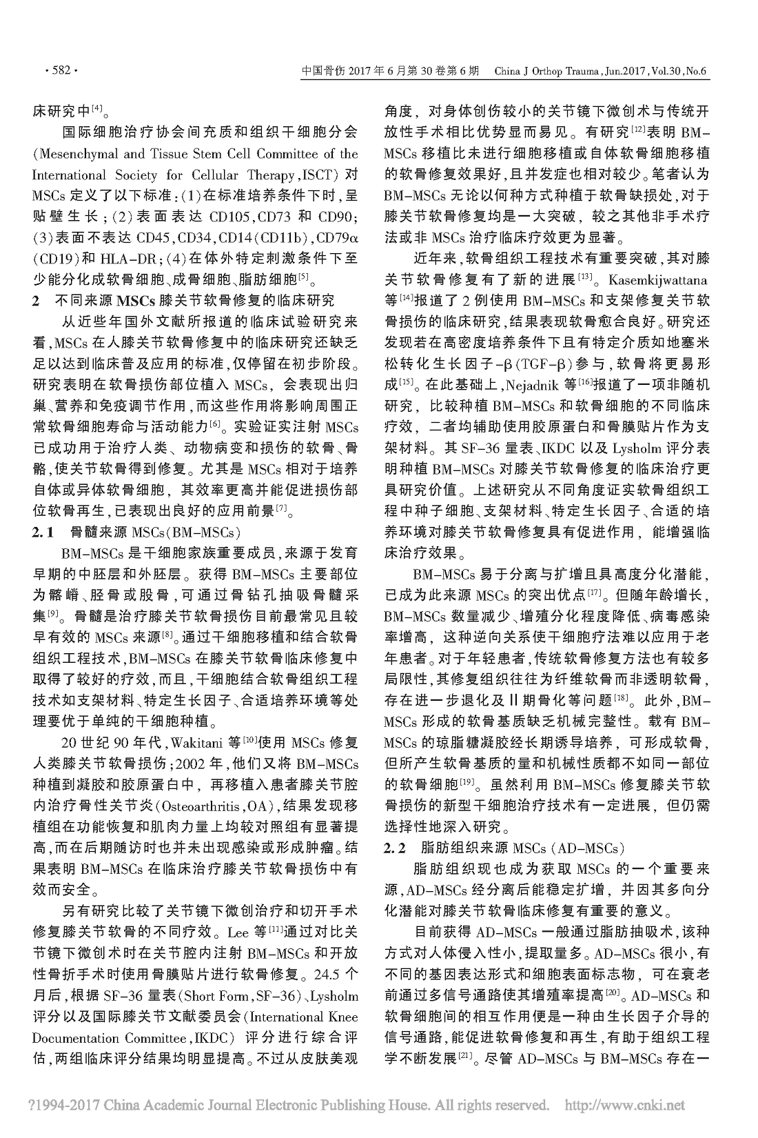 不同来源间充质干细胞在膝关节软骨修复中的临床研究进展