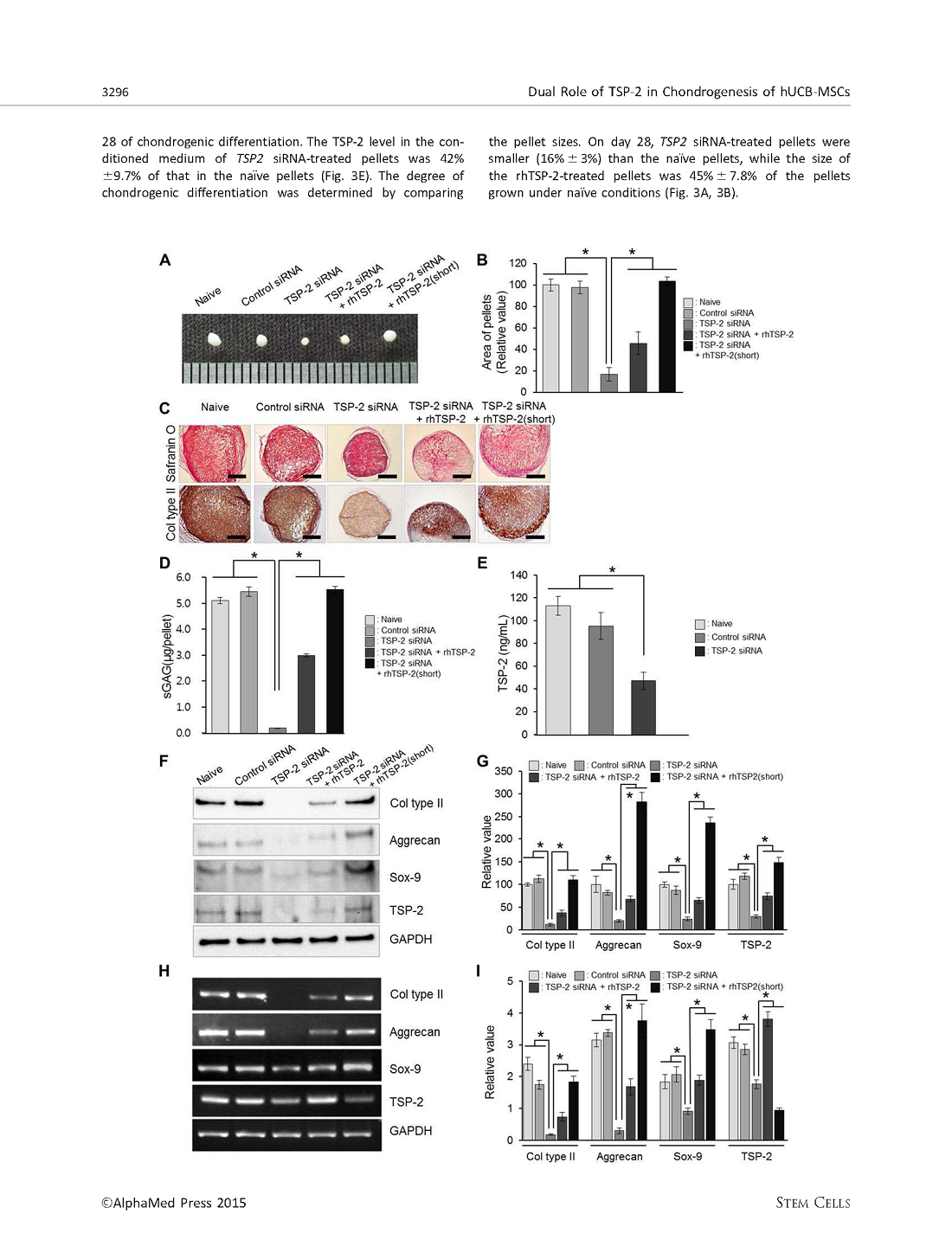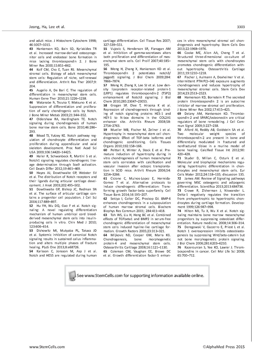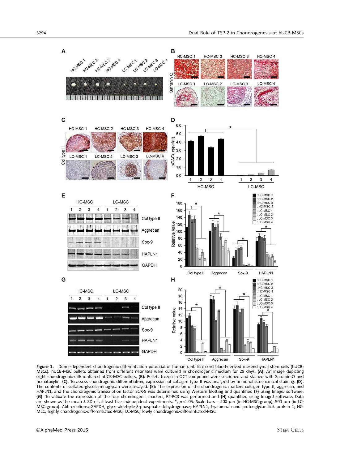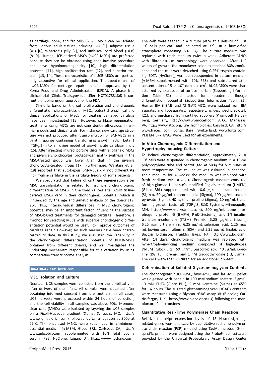 先前的研究已经证明:间充质干细胞可以有效地治疗多种疾病,包括软骨缺损。该研究中,来源于不同捐赠者的人脐带血间充质干细胞的软骨细胞分化潜能是不同的。微阵列基因表达分析发现,血小板反应蛋白-2(TSP-2)作为评价脐血间充质干细胞成软骨细胞分化潜能个体差异的候选基因。为了评估TSP-2和分化潜能之间的联系,我们评估例了TSP2 siRNA处理的脐血间充质干细胞向软骨细胞分化的潜能。此外,我们研究了补充外源性重组TSP-2对TSP2 siRNA治疗脐血间充质干细胞的影响。我们发现, TSP-2的旁分泌通过Notch信号通路促进脐血间充质干细胞向软骨分化,该通路已经被其他来源间充质干细胞证实,如骨髓和脂肪间充质干细胞。有趣的是,研究还发现TSP-2不可避免的出现了脐血间充质干细胞向软骨分化过程中的衰减肥大。我们的研究结果表明,不同捐赠者骨髓间充质干细胞向软骨的分化潜能受到分化细胞TSP-2水平影响。因此,TSP-2水平可以作为具有优越成软骨细胞分化潜能的间充质干细胞用于软骨再生疗法一个标记物。