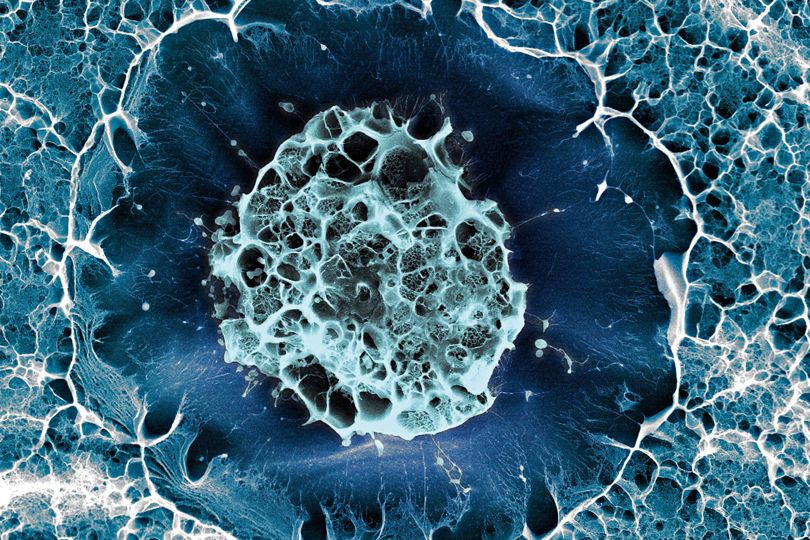 这是从人类髋骨骨髓中获取的一个干细胞,宽15微米。伦敦国王学院的研究团队利用低温扫描电子显微镜拍摄了该图片。他们将干细胞放在水凝胶中,调整各种条件,模拟细胞的自然状态。包含50万个细胞的样品置于零下150度的低温中,接着对半断裂,从而使科学家能观察断裂表面上的细胞。