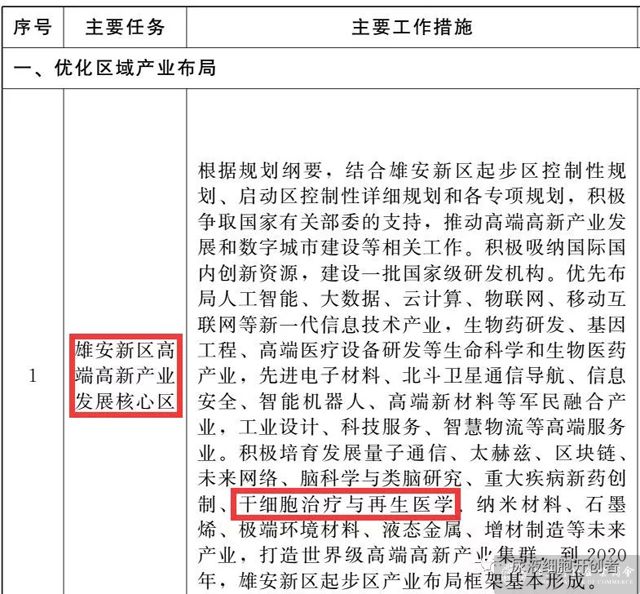 日前,河北省人民政府办公厅印发《关于加快推进工业转型升级建设现代化工业体系的指导意见任务分工方案》的通知,方案中明确提出:要打造雄安新区高端高新产业发展核心区,积极发展干细胞治疗和再生医学产业,到2020年,雄安新区起步区产业布局框架基本形成。