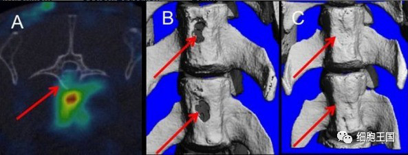 图1  A 干细胞靶点的脊柱骨折;B 两个脊椎骨折;C 干细胞与甲状旁腺素治疗 8 周后修复的脊柱