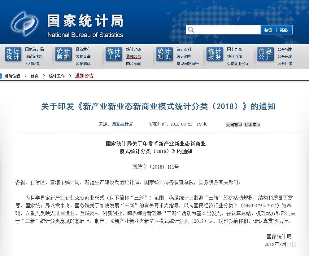 近日,国家统计局正式公布了《新产业新业态新商业模式统计分类(2018)》,这是根据党中央、国务院关于加快发展新产业新业态新商业模式(简称“三新”)的要求,为科学界定“三新”活动范围,满足统计上监测“三新”经济活动规模、结构和质量等需要,制定本分类。
