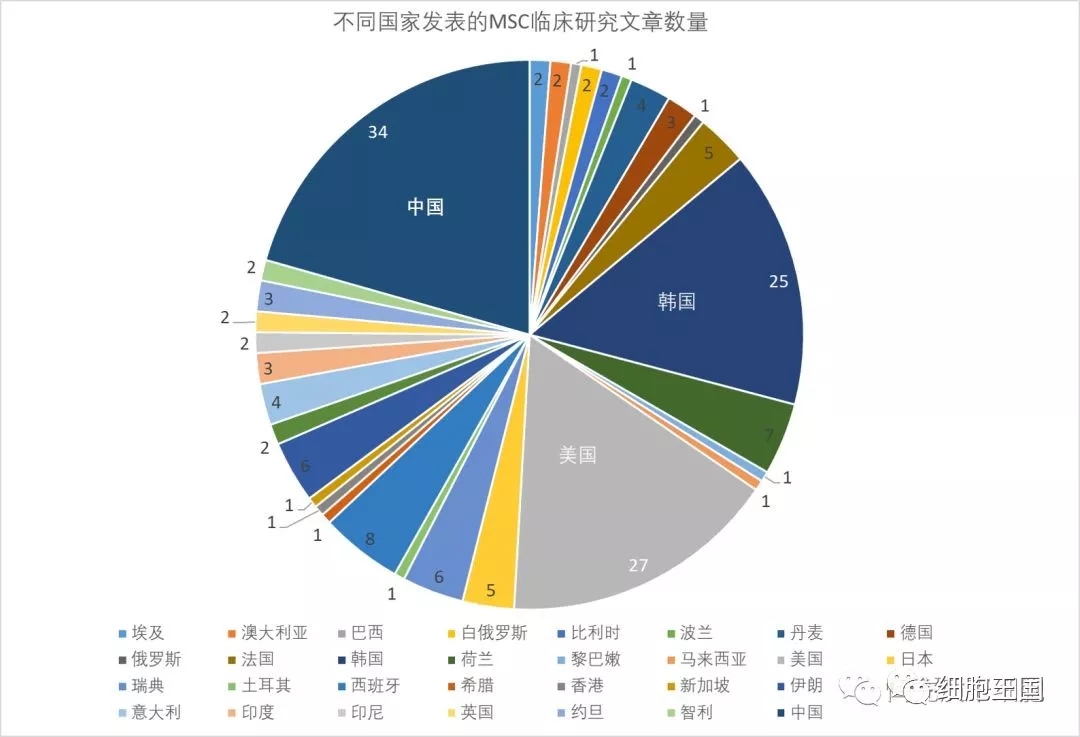 MSC临床研究文章的作者单位分布在31个国家(见下图)。毫无意外,中国34篇碾压其他国家,独占鳌头;美国27篇和韩国25篇紧随其后。